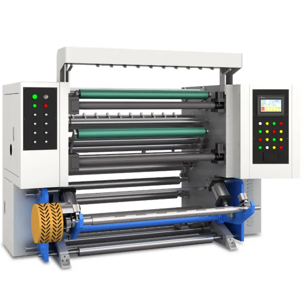 高速分切机 GW-1300Z高速分切机适用于分切玻璃纸、PET、OPP、CPP、PE、PVC和电脑防伪标签、电子电脑、光学材料、薄膜卷、箔卷、各种纸卷、薄膜和各种材料的印刷,以及其他. 该机器采用PLC集中控制,根据不同的分切技术控制张力、速度、米数、校正等。该机器具有稳定张力、启动和缓冲、停止和防松、固定分切等功能,操作简单。收料轴和牵引辊采用变频电机。 放料和收料的张力可以灵活调节,更便于不同类型卷筒纸和薄膜的分切。复卷采用空气轴,保证快速装卸。