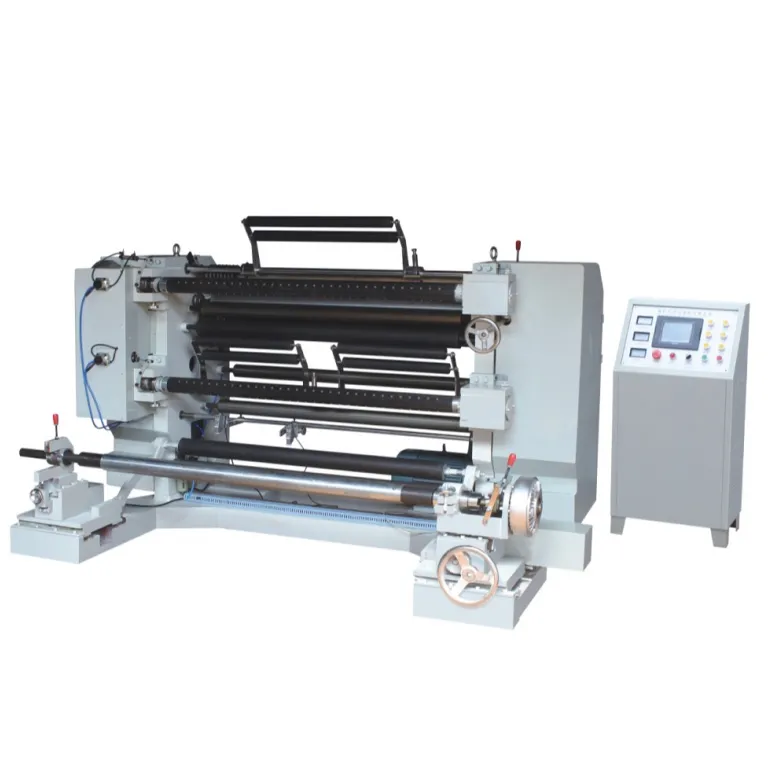 铝箔分切复卷机 本机器特别适用于铝箔的分切,将大卷分切成小卷。它用于微机控制、光电自动纠偏、自动计数、张力磁粉控制放卷和复卷、使用气动刀片、手动微调等。本机器还可以切割BOPP、PVC、PET、OPP、PE等纸张和塑料薄膜。
